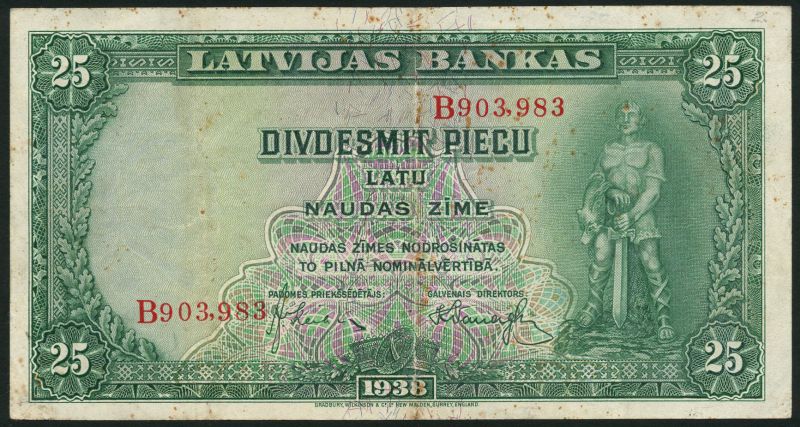 Bank of Latvia, a miscellaneous group including 25 latu, 1938, green, 5 latu, 1926, and 10 latu, 1925, 10 latu, 1937, 20 latu, 1935