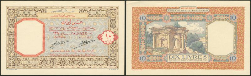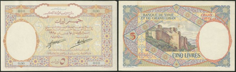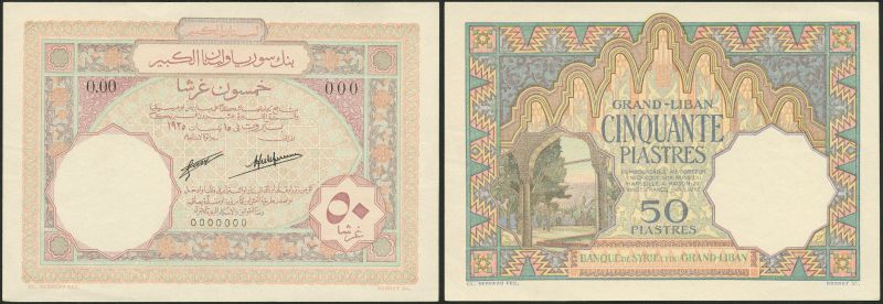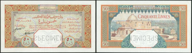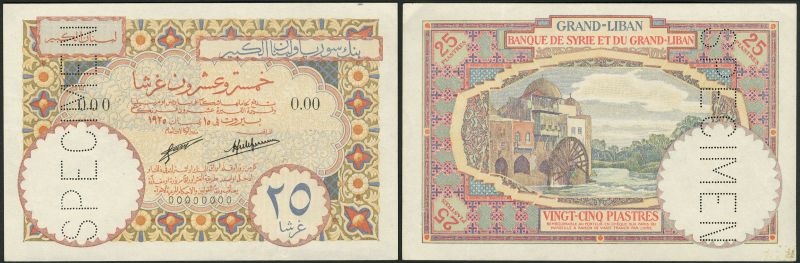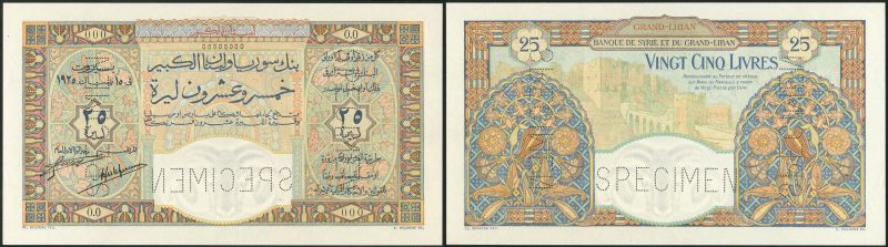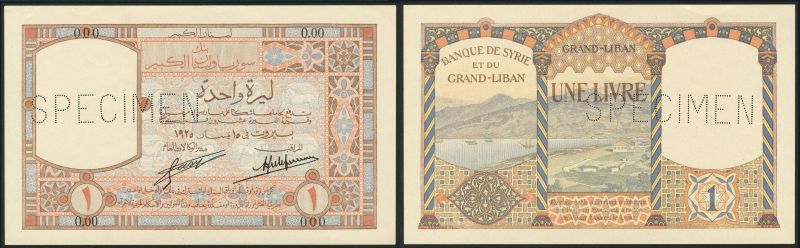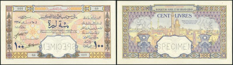 (x) Banque de Syrie et du Grand-Liban, Lebanon, a set of specimens of the first issue of Lebanon as Grand-Liban, 1925 second issue comprising 25 and 50 piastres, 1, 5, 10, 25, 50 and 100 livres