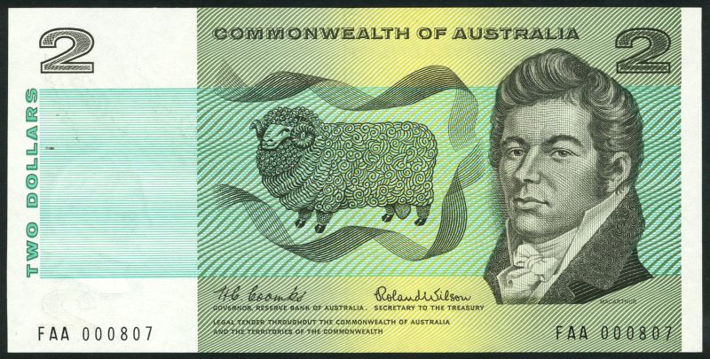 (x) Commonwealth of Australia, $2, ND (1966), serial number FAA 000807, green and multicoloured, McArthur at right, ram at centre, Coombs-Wilson signatures
