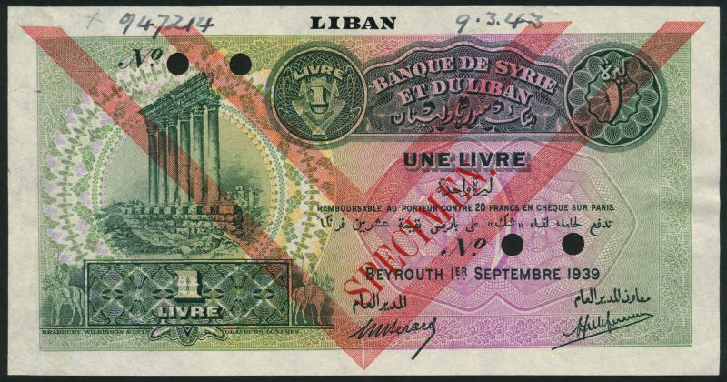 (†) Banque de Syrie et du Liban, specimen 1 livre, 1 September 1939, green and multicoloured, the pillars of Baalbek at left, red double chevron in field, LIBAN in top margin, reverse red and olive, city view at centre, value at each corner, red double chevron at centre