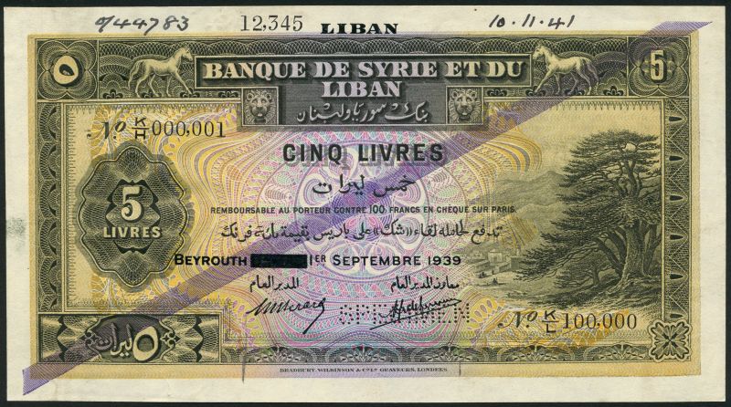 (†) Banque de Syrie et du Liban, specimen 5 livre, 1 September 1939, serial number K/H 000001-K/L 100000, black, yellow-orange and lilac, cedar tree at right, value at left, horse top left and right, lilac diagonal in field, LIBAN in top margin, reverse brown and green and blue, city view in oval frame at left and right, lilac diagonal in field