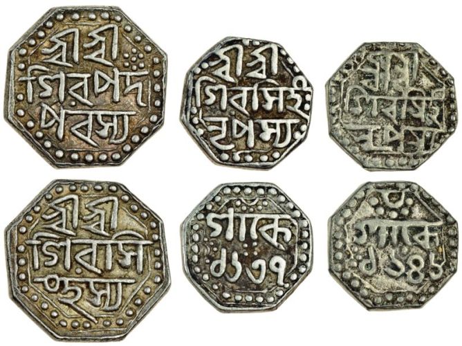 Assam, Śiva Simha, octagonal Half-Rupee, 5.61g, no queen, undated, legends in three lines on each side: Śri Śri/ Śiva Pada/Parasya, rev. Śri Śri/ Śiva Si/mhasya; octagonal Quarter-Rupees (2), Sk. 1637, 1646, 2.84, 2.61g, Śri Śri/ Śiva Simha/ Nripasya, rev. Śake/ date (RB. G15.1, G16.1, G19.1; KM. 49, 47), very fine, the Quarter-Rupees rare (3)