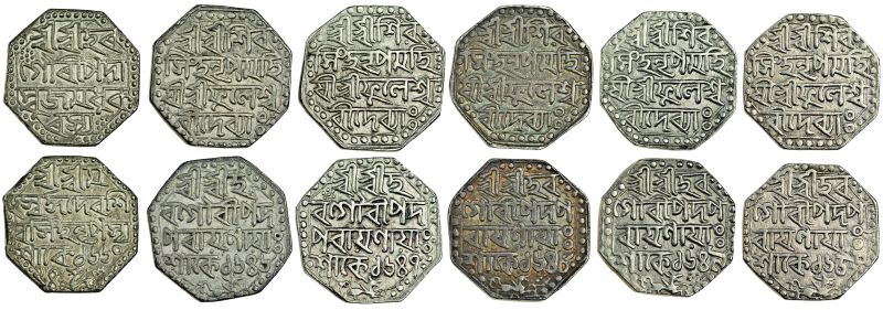 Assam, Śiva Simha, octagonal Rupees (6), Sk. 1646 (2), 1647, 1648, 1649, 1650, citing Queen Phulesvari, legends in four lines on both sides, Śri Śri Ha/ra Gauri Pada/ Parayanayah/ Śake date, rev. Śri Śri Śiva/ Simha Nripa Mahi/si Śri Phulesva/ra Devyah (RB. H7.1, H8.1, H9.1, H11.1, H12.1, H13.1; KM. 61), very fine (6)
