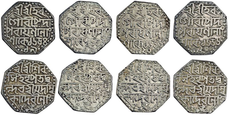 Assam, Śiva Simha, octagonal Rupees (4), Sk. 1654 year 19, 1655 year 19, 1655 year 20, 1656 year 20, citing Queen Ambika, legends as previous lot (RB. K6.1, K7.1, K8.1, K9; KM. 91), very fine to good very fine (4)