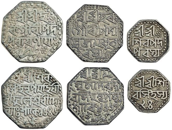 Assam, Śiva Simha, octagonal Rupees (2), 11.13, 11.32g, Sk.1660 year 24, 1660 year 25, without queen, Śri Śri Hara/ Gauri Pada/mbuja Madhuka/rasya, rev. Śri Śrima/t Svarga Deva Śi/va Simha Nripasya/ Śake 1660/year; lion facing left, next to regnal year; octagonal Half-Rupee, 5.63g, year 24, without queen,. Śri Śri/ Śiva Pada/ Parasya, rev. ŚriŚri Śi/va Simhasya/24 (RB. L4.1, L5.1, L8.1; KM. 104, 102), very fine to good very fine, the Half-Rupee rare (3)