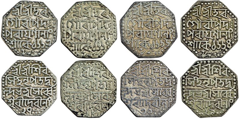 Assam, Śiva Simha, octagonal Rupees (4), Sk. 1663, year 27, 1664 year 28, 1664 year 29, 1665 year 30, citing Queen SarvveŚvari, legends as previous lot (RB. M9.1, M10.1, M11.1, M13.1; KM. 112), very fine (4)