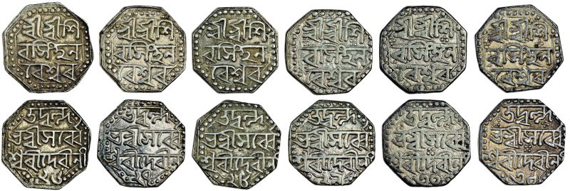 Assam, Śiva Simha, octagonal Half-Rupees (6), years 26, 27, 28, 29, 30, 31, citing Queen Sarvvesvari, Śri Śri Śi/va Simha Na/resvara, rev. Tadvalla/bha Śri Sarvve/Śvari nam/ [regnal year] (RB. M18.1, M19.1, M20.1, M21.2, M22.1, M23.2; KM. 110), very fine (6)