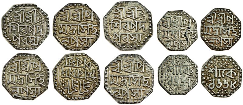 Assam, Pramatta Simha, octagonal Half-Rupees (3), undated, Śri Śri/ Śiva Pada/ Parasya, rev. Śri; Śri Pra/matta Simha/ Nripasya; octagonal Quarter-Rupees (2), Sk. 1667, 1668, Śri Śri Pra/matta Simha/ Nripasya, rev. Śake/ [date] (RB. N15, N16.1, N17.1; KM. 120, 118), very fine, the Quarter-Rupees scarce (5)
