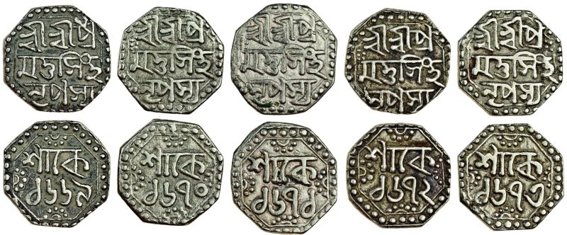 Assam, Pramatta Simha, octagonal Quarter-Rupees (5), Sk. 1669, 1670, 1671, 1672, 1673, legends as previous lot (RB. N18.1, N19.1, N20.1, N21.1, N22; KM. 118), very fine, scarce to rare (5)