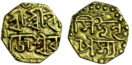 Assam, Rajesvara Simha, octagonal gold 1/8-Mohur, 1.40g, undated, obv. Śri; Śri Ra/jesvara; rev. Simha Nri/pasya (RB. O33.1; KM. 137), very fine, rare