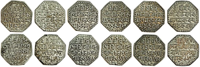 Assam, Rajesvara Simha, octagonal Rupees (6), Assamese script, Sk. 1674, 1675, 1676, 1677, 1678, 1679, Śri Śri Hara/ Gauri Charana Ka/mala Makaranda/ Madhukarasya, rev. Śri Śri Svarga/ Deva Śri Rajesva/ra Simha Nripasya / Śake date, winged lion running left, below (RB. O36.1, O37, O38.1, O39.1, O40.1, O41.1; KM. 134), very fine (6)