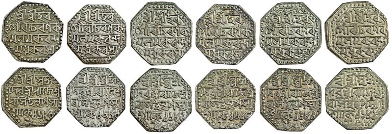 Assam, Rajesvara Simha, octagonal Rupees (6), Assamese script, Sk. 1680, 1681, 1682, 1683, 1684, 1685, legends as previous lot (RB. O42.2, O43.1, O44.1, O45.1, O46.2, O47.1; KM. 134), very fine to good very fine (6)