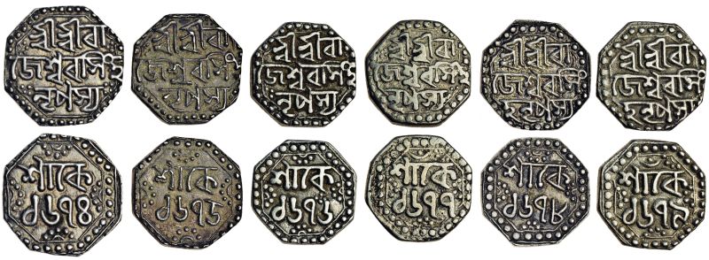 Assam, Rajesvara Simha, octagonal Quarter-Rupees (6), Assamese script, Sk. 1674, 1675, 1676, 1677, 1678, 1679, obv. Śri Śri Ra/jesvara Simha/ Nripasya, rev. Śake/ date, some coins with a crescent and bead above the first line of the reverse (RB. O57.1, O58.1, O59.1, O60.1, O62.1, O63.1; KM. 132), very fine, scarce (6)