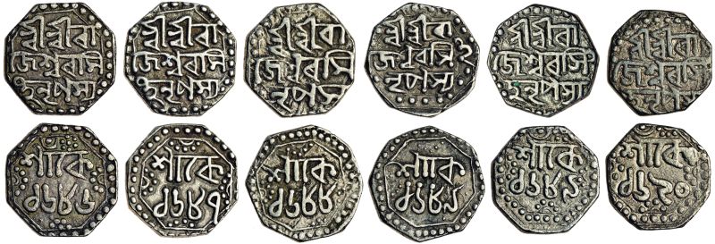 Assam, Rajesvara Simha, octagonal Quarter-Rupees (6),, Assamese script, Sk. 1686, 1687 (2), 1688, 1689 (2), 1690, legends as previous lot, with simha on the obverse either all on the second line or split between the second and third line (RB. O71.1, O72.1, O73.1, O74.1, O74.3, O76.1; KM. 132), very fine, scarce (6)
