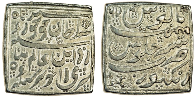 Rajesvara Simha, square Rupee, 11.28g, Persian script, Sk. (1)674, Rangpur mint, in sikkah zad chu haq ze mihr mah, sri rajesvara singh sultan 'Alam panah (Sri Rajesvara Simha, refuge of the world, struck this coin truly like the sun and the moon), rev. zarb rangpur sanah 674 jalus maimanat manus, small winged lion running to right, at bottom (RB. O88.1; KM. 155), good very fine, scarce