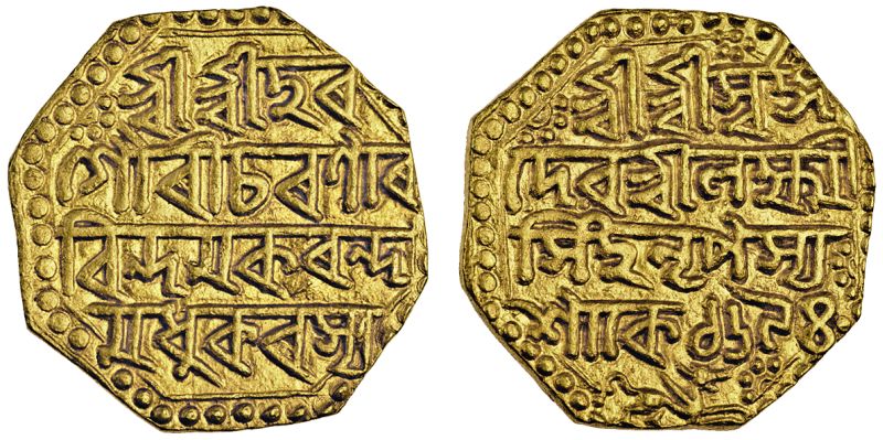 Assam, Lakshmi Simha (Siu-nyeo-pha) (1770-1780), octagonal gold Mohur, 11.38g, Assamese script, Sk. 1694, Śri Śri Hara/ Gauri Charanara/vinda Makaranda/ Madhukarasya, rev. Śri Śri Svarga/ Deva Śri Laksmi/ Simha Nripasya / Śake 1694, lion below, running right (RB. Q4.1; KM. 188), good very fine, rare