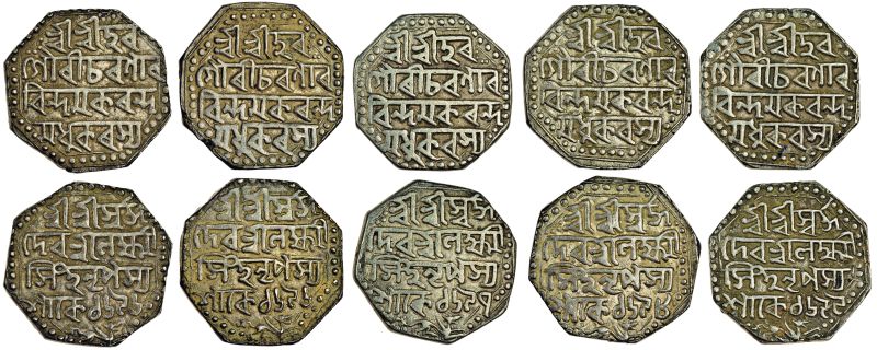 Assam, Lakshmi Simha, octagonal Rupees (5), type and legends as previous lot, Sk. 1696 (2) (die variants), 1697, 1698, 1699 (RB. Q29.1, Q29.3, Q30.1, Q31, Q32.1; KM. 182), very fine (5)