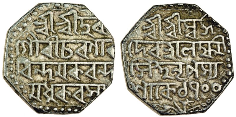 Assam, Lakshmi Simha, octagonal Rupee, 11.34g, Sk. 1700, type and legend as previous lot but rare date (RB. Q33.1; KM. 182), very fine