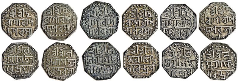 Assam, Lakshmi Simha, octagonal Half-Rupees, undated, with invocation to Śiva and Parvati, Śri Śri Ha/ra Gauri Pa/da Parasya, rev. Śri Śri La/ksmi Simha Na/rendrasya, with some variation in the layout of the legends on either side, and one coin with 1 in the lower border (RB. Q36, Q37, Q39.1, Q39.2, Q40.1, Q43.1; KM. 178,179, 180), very fine (6)