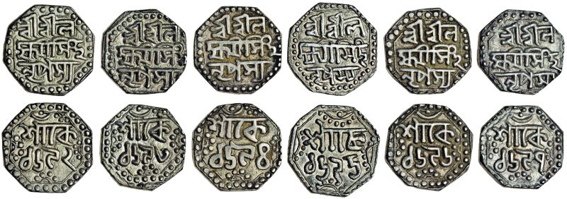 Assam, Lakshmi Simha, octagonal Quarter-Rupees, Sk. 1692, 1693, 1694, 1695, 1696, 1697, Śri Śri La/ksmi Simha/ Nrpasya, rev. Śake/ date (RB. Q47.2, Q48.1, Q49.1, Q50, Q51, Q52.1; KM. 176), very fine to extremely fine (6)