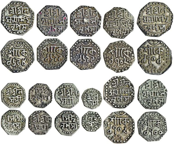 Assam, Lakshmi Simha, octagonal Quarter-Rupees (7), Sk. 1698, 1699 (2), 1700, 1701, 1702 (2), legends as previous lot; octagonal 1/8-Rupees (3), undated, obv. Śri Śri La/ksmi, rev. Simha/ Nripasya; Sixteenth-Rupee, undated (RB. Q53, Q54.1, Q55, Q56.1, Q57.1, Q59, Q60.1; KM. 176, 175, 174), very fine (11)
