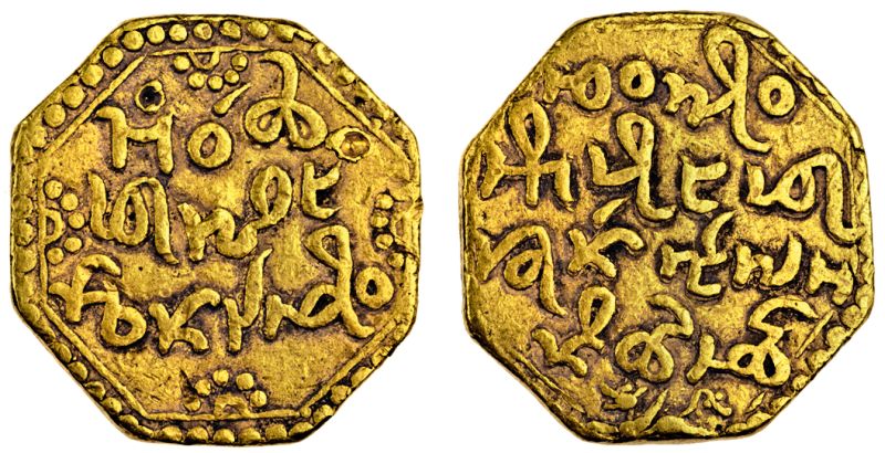Assam, Gaurinatha Simha (1780-95), octagonal gold Mohur, 11.25, Ahom legends, dated year 13 (of the 60 year cycle), Chao Boi/ Pha Leng-de/don Heu Ciu, rev. Siu-hit-/pang-pha/ Khun ngen La/k-ni Rai-cheu (RB. R1.1; KM. 233), a couple of small punchmarks on the obverse, of the highest rarity, good very fine