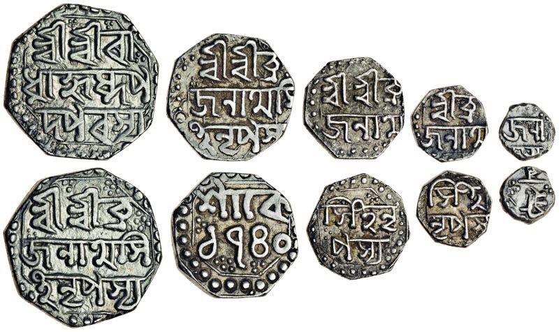 Assam, Brajnatha Simha, octagonal Half-Rupee, 5.65g, undated, Quarter-Rupee, 2.82g, Sk. 1740, 1/8-Rupee, 1.46g, undated, Śri Śri Bra/janatha, rev. Simha Nri/pasya, 1/16-Rupee, 0.72g, 1/32-Rupee, 0.34g, legends as previous lot except for the 1/8-Rupee (RB. T10, T13.1, T14, T16.1, T17; KM. 264, 263, 262, 261, 260), very fine, all scarce (5)