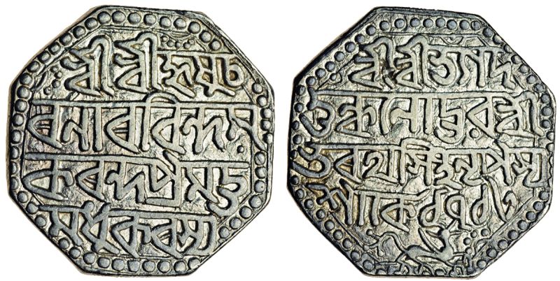 Assam, Bharatha Simha (1789-94, 1796-97), octagonal Rupee, 11.26g, Sk. 1713, Śri Śri Krishna Cha/ranaravinda Ma/karanda Pramatta/ Madhukarasya, rev. Śri Śri Bhagada/tta Kulodbhava Śri/ Bharatha Simha Nripasya / Śake 1713, winged lion running right, below (RB. 5.1; KM. 405), very fine, scarce