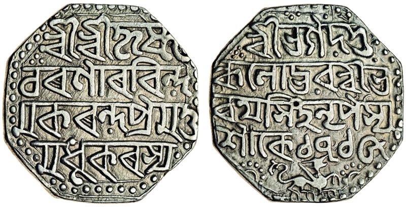 Assam, Bharatha Simha, octagonal Rupee, 11.34g, Sk. 1715,. Śri Śri Krishna / Charanaravinda/ Makaranda Pramatta Ma/dhukarasya, rev. Śri Bhagadatta/ Kulodbhava Śri Bha/ratha Simha Nripasya / Śake 1715, winged lion running right, below (RB. W8; KM. 405), very fine, scarce