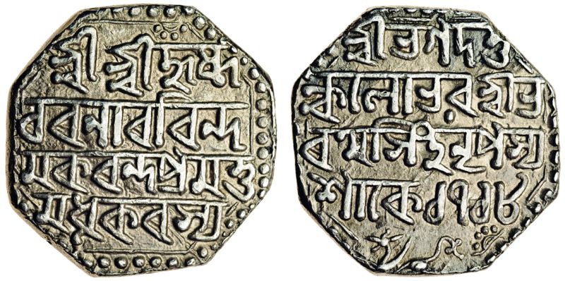 Assam, Bharatha Simha, octagonal Rupee, 11.30g, Sk. 1718, Śri Śri Krishna / Charanaravinda/ Makaranda Pramatta/ Madhukarasya, rev. Śri Bhagadatta/ Kulodbhava Śri Bha/ratha Simha Nripasya / Śake 1718, winged lion running left, below (RB. W9.2; KM. 405), very fine, scarce