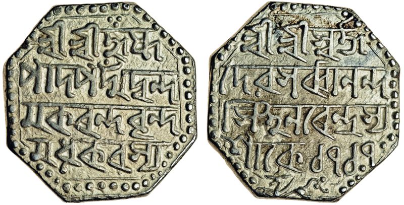 Assam, Sarvvananda Simha, octagonal Rupee, 11.42g, Sk. 1717, obv. Śri Śri Krishna / Pada Padma Dvanda/ Makaranda Brnda/ Madhukarasya, rev. Śri Śri Svarga/ Deva Śri Sarvvana/nda Simha Nripasya / Śake 1717, lion running to left at bottom (RB. X8.2; KM. 309), very fine, scarce