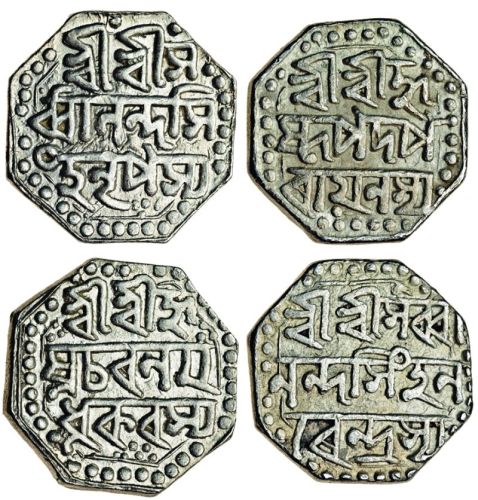 Assam, Sarvvananda Simha, octagonal Half-Rupees (2), 5.85, 5.69g, undated, different obverse legends, and slightly different reverse legends: obv. Śri Śri Kri/shna Charana Ma/dhukarasya, rev. Śri Śri Sa/rvvananda Si/mha Nripasya, obv. Śri Śri Kri/shna Pada Pa/rayanasya, rev. Śri Śri Sarvva/nanda Simha Na/rendrasya