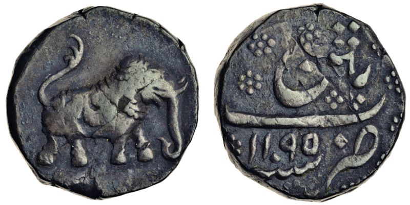 Mysore, Haidar 'Ali (AH 1174-1197; AD 1761-82), AE Paisa, Patan, AH 1195, elephant to right (KM. 5.1), very fine, scarce