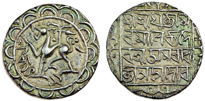 The coins of this ruler are amongst the commonest of the whole Tripura series. Some of the dies used exist in a number of states with one or more beads added, while there is considerable variation in the form of the standard that issues from the lion's back. It should be noted that the KM catalogues do not list these varieties separately, nor similar ones for other rulers.