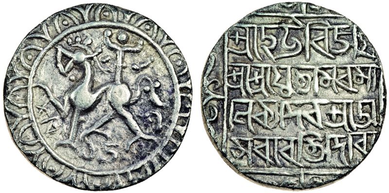Tripura, Amara Manikya, Tanka, 10.45g, Sk 1503, citing Queen Amaravati, commemorating the conquest of Sylhet, as previous lot but bead added below lion's head (RB. 171; KM. 92), very fine