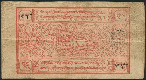 Tibet, 10 Tam, dated T.E. 1659 (= AD 1913), red, serial number 20590, Obverse: Within the central cartouche, a crouching snow lion, facing left and looking backwards; he is playing with a ball which in Tibetan is referred to as yid bzhin nor bu dga´ khyil ("wish granting jewel, whorl of happiness"). The black seal to the right is not clearly printed, but probably of type 1B. Reverse: A large central rectangle is filled with flowers and scroll work at the four corners. In the centre a vase is surrounded by leaves and flowers. The vase is composed of the eight auspicious Buddhist emblems (bkra shis rtags brgyad); the lotus flower below carries the knot of life which in turn supports the wheel of the doctrine with the two golden fishes on either side. Placed above are the banner of victory and the parasol with the white conch on top. The eighth emblem is the vase which is made up of the seven emblems just enumerated. This way of arranging the eight auspicious emblems is called rtags brgyad bum gzhugs ("eight emblems in form of a vase") in Tibetan. (Pick 2, YZM -), about very fine and very rare