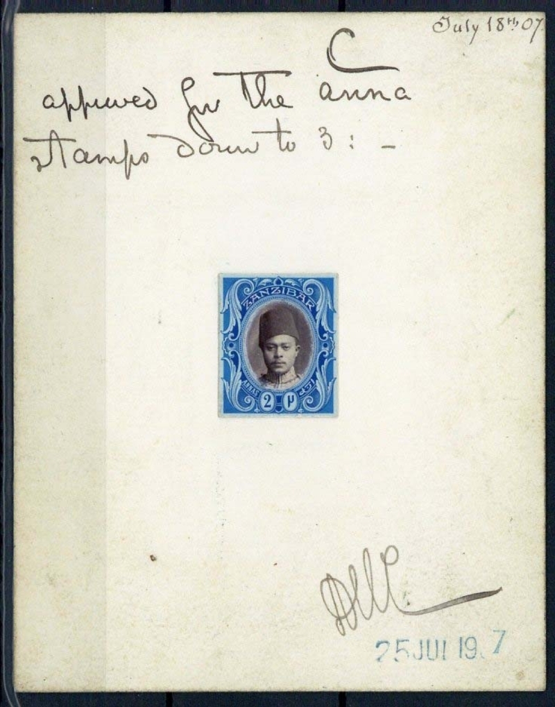 2a. composite photographic type with the vignette in grey-purple and the frame in bright blue with touching up in Chinese white between the two in the issued design of the 1c. to 12c. values though denominated "annas", affixed to card (89x114mm.) dated "July 18th. 07", subsequently marked "Approved for the anna stamps down to 3:-", initialled and dated "25 july 1907"