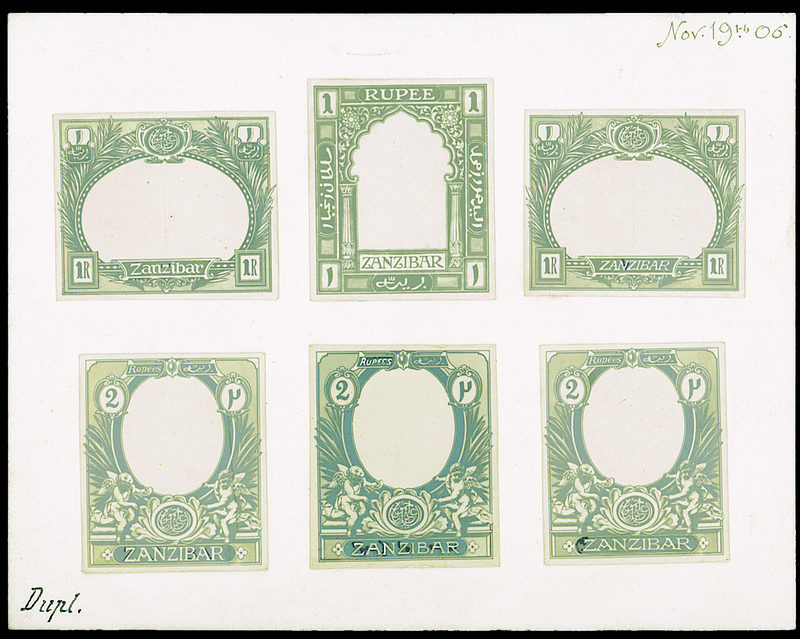 1r. (3) and 2r. frames in a variety of designs with one 1r. close to the issued design, all photographic with some letters touched in by hand and one of the 2r. with replaced "zanzibar", affixed to card (114x89mm.) marked "Dupl" and dated "Nov 19th. 06". Photo