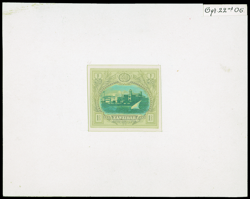 1r. showing View of Port, composite photographic type with the vignette handpainted in shades of blue, mica-covered and affixed on card (114x89mm.) dated "Oct. 22nd. 06" with overlay card cut with a frame. Photo