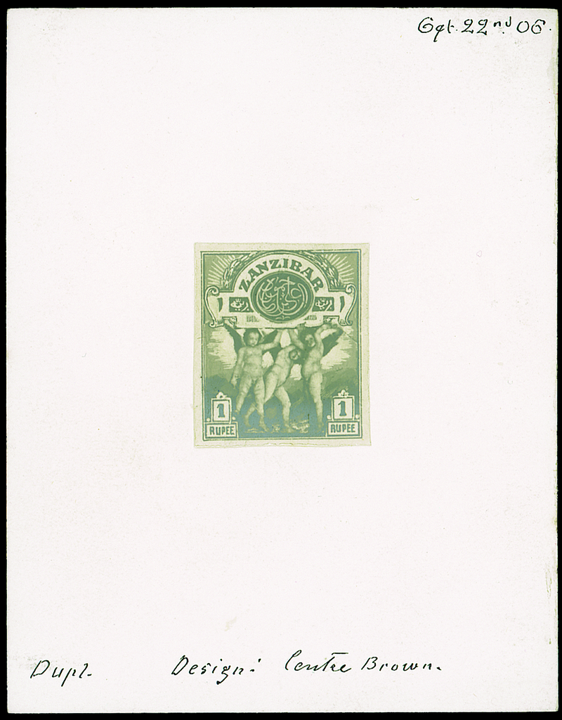 1r. showing View of Port, composite photographic type with the vignette handpainted in shades of blue, the frame in shades of brown, mica-covered and affixed on card (114x89mm.) dated "2 oct. 1906" with overlay card cut with a frame. Photo