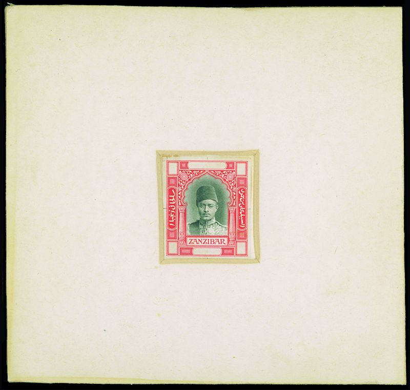 1r./5r. head and frame with blank value tablets, in black and scarlet on wove paper showing guide marks on all four sides, affixed in thick card sunken frame (125x118mm.); the proof with a couple of small faults, otherwise fine and most attractive. Photo