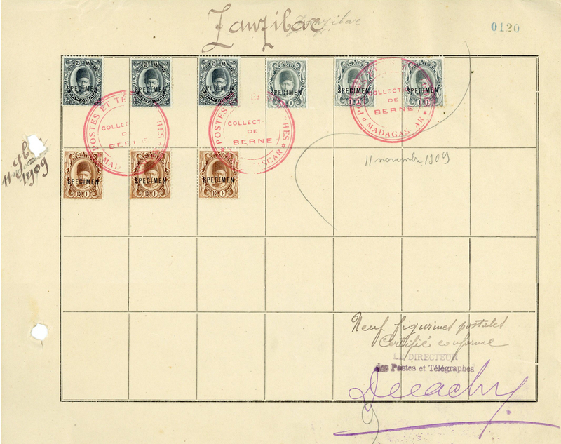 1c., 10c. and 75c. 1909 values, three examples of each overprinted "specimen" and tied on complete ledger page cancelled with strikes of the "postes et telegraphes/collection/de/berne/madagascar" handstamp in red. A unique trio