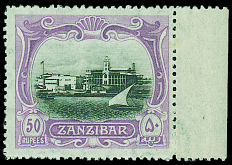 50r. black and mauve, marginal from the right of the sheet, lightly mounted mint; a couple of gum bends, otherwise fine. S.G. 243, £700. Photo