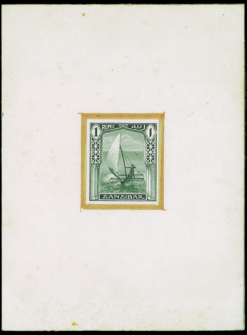1r. in black, stamp-size on wove paper, affixed in thick card sunken frame (93x126mm.); fine. Photo