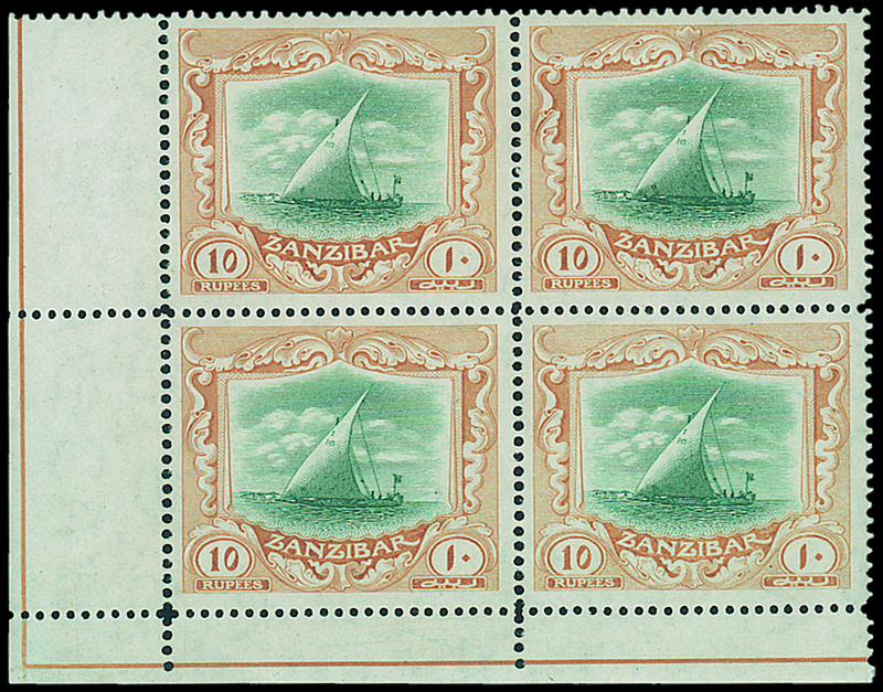 — 10r. green and brown lower left corner block of four, superb unmounted mint. A very fine and rare multiple. S.G. 275, £760+. Photo
