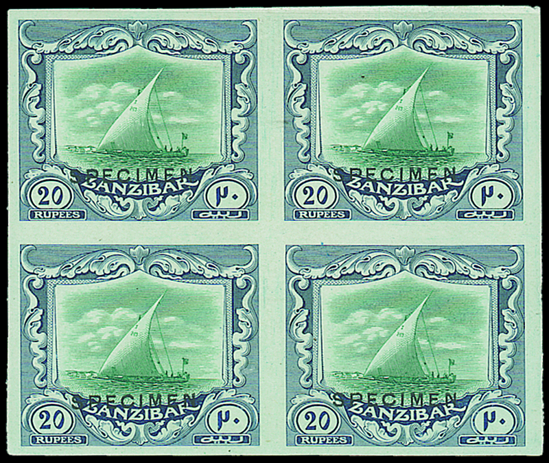 20r. blue-green and indigo imperforate block of four on gummed unwatermarked paper, a block of four each overprinted "specimen" (DS2); fine. Photo