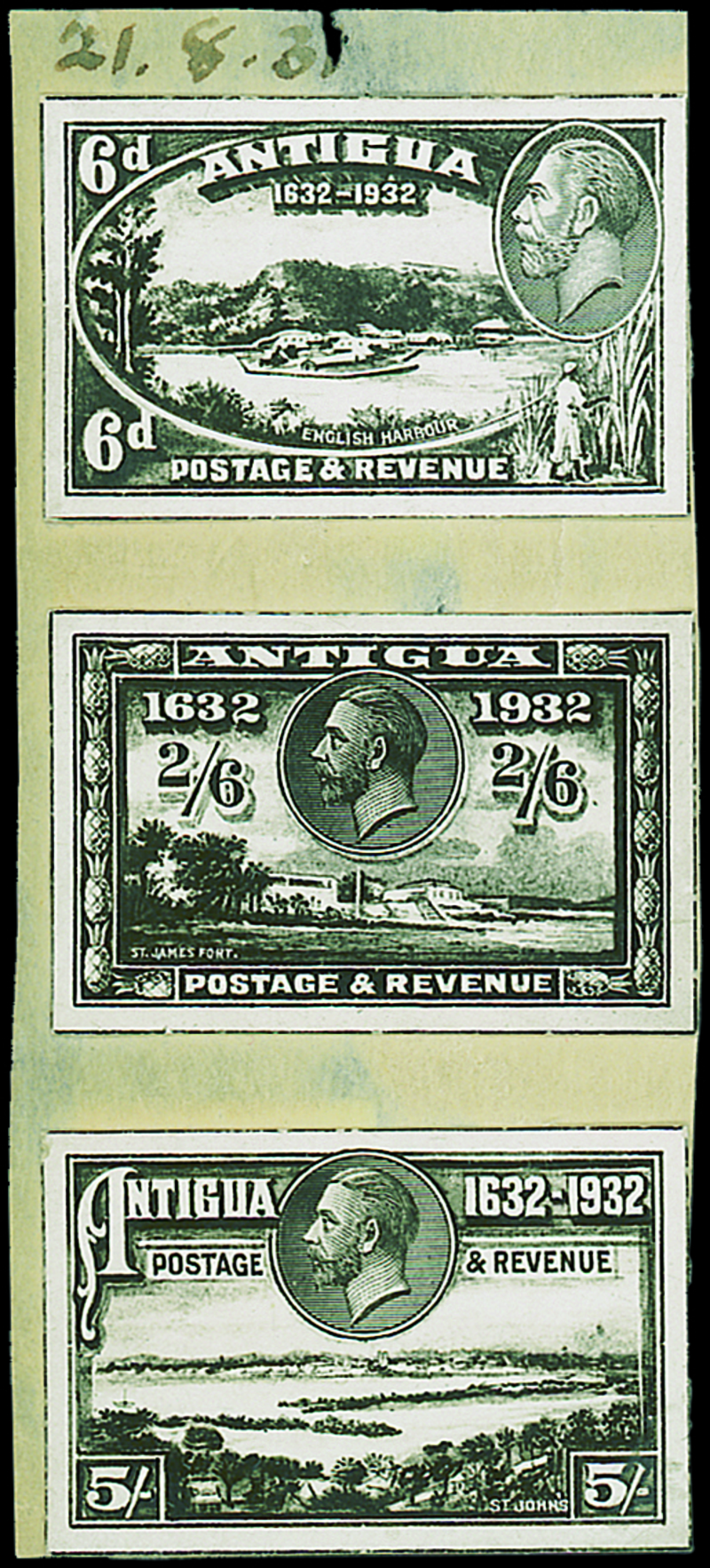 1931 (21 Aug.) Tercentenary 6d., 2/6d. and 5/- unadopted designs. Photo