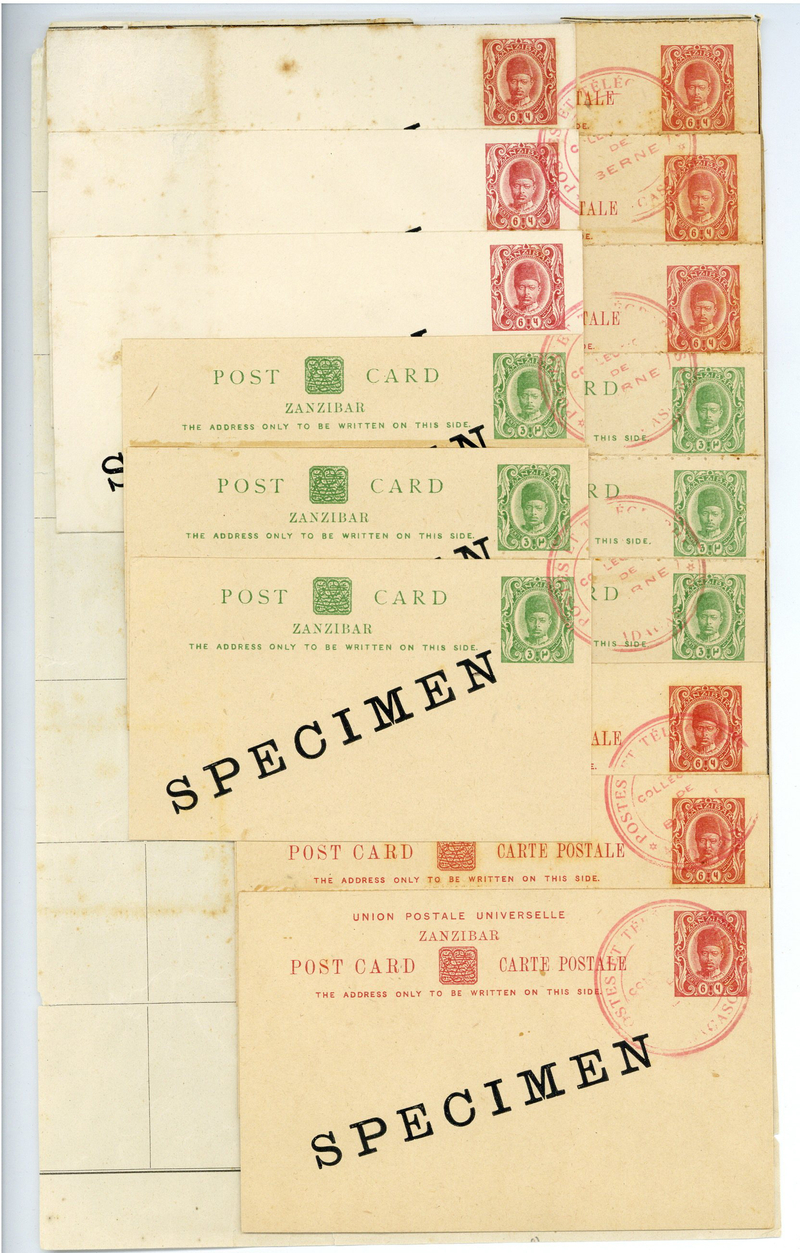 1908 3c. and 6c., 3c. and 6c. reply paid cards and 6c. envelope, three examples of each all overprinted "specimen", overlapping and tied on large part ledger page cancelled with strikes of the "postes et telegraphes/collection/de/berne/madagascar" handstamp in red; a few small faults though a unique group