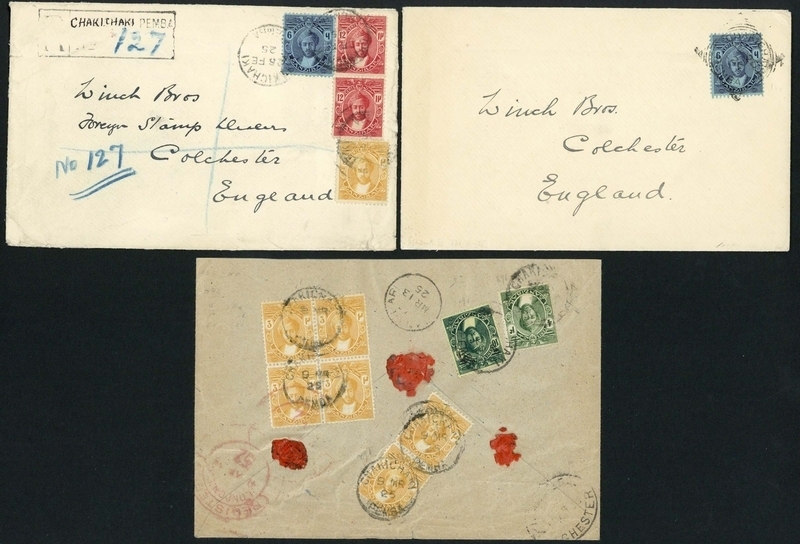1924 and 1925 (2, both registered) envelopes ex Winch Brothers correspondence from Chaki Chaki, Pemba to England, the first bearing 6c. cancelled by squared-circle datestamps, the other two franked at 32c. or 33c. (1c. overpaid) and cancelled by c.d.s. with both showing registration cachet, one with adhesives on reverse, the other with registration cachet assisted. A generally attractive trio
