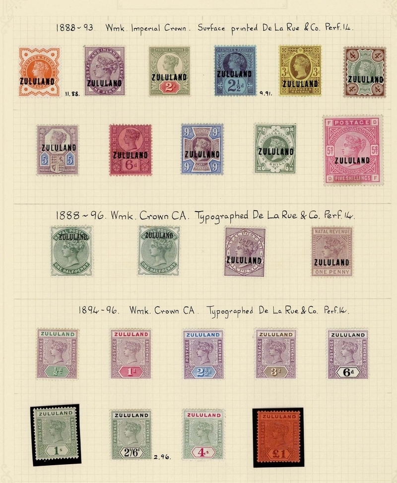 1888-93 set with both ½d. dull green, 1893 6d., 1894-96 set to £1 and Postal Fiscal 1d., largely mint; the 5/- poor, the others (including £1) generally good to fine